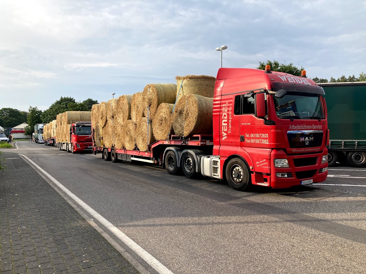 Drei unserer Transporter sind vollbeladen mit 81 Strohballen am Samstagmorgen 24.07.2021 in das Hochwassergebiet zwischen Aachen und Köln, Nähe der belgischen Grenze, dem Kreis Düren aufgebrochen, um die Futterspenden abzuliefern.