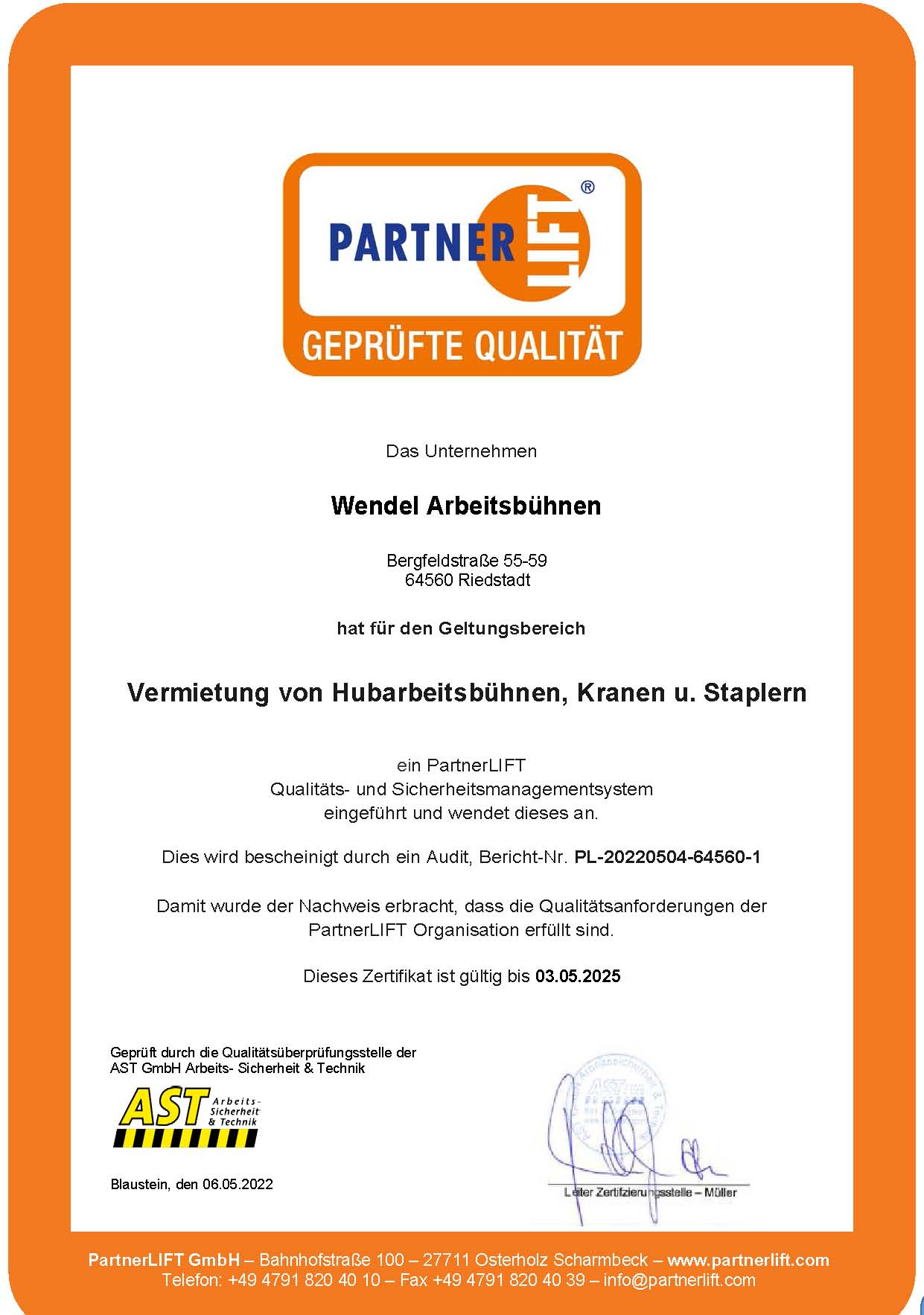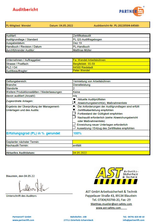 Es wurde durch einen unabhängigen Prüfer bestätigt, dass alle notwendigen Qualitätsanforderungen erfüllt werden und zeigt, dass das Unternehmen Wendel Arbeitsbühnen ein verlässlicher Partner in Sachen Arbeitsbühnen ist.
