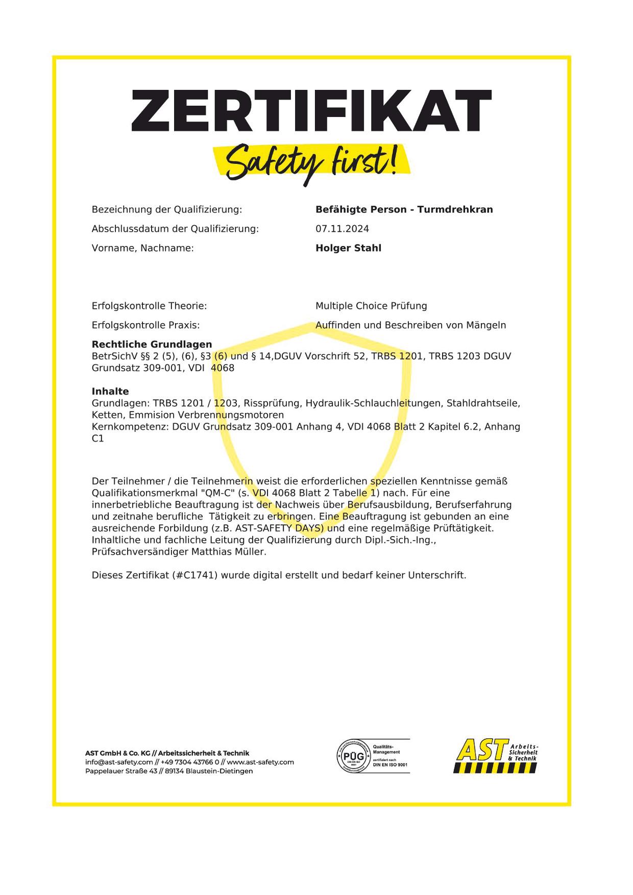 Den Start machte Holger Stahl mit der bestandenen Prüfung als "befähigte Person - Turmdrehkran"