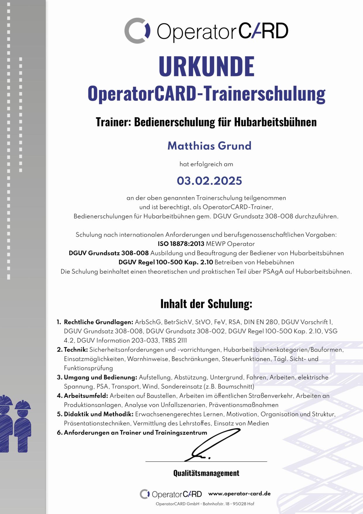 Unsere Trainer haben an Fortbildungen teilgenommen um SIE und Ihre Mitarbeiter fachgerecht und zeitgemäß zum Thema Hubarbeitsbühnen, Stapler und Krane schulen zu können.