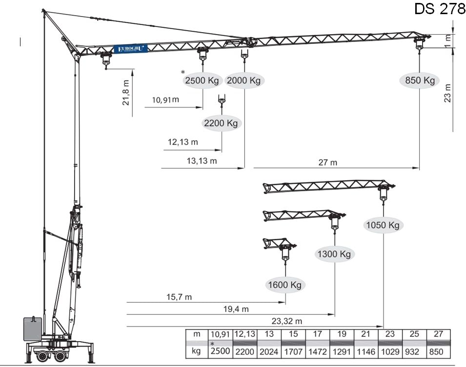 bei Steilstellung bis 32,50 m/1.000 kg konstant