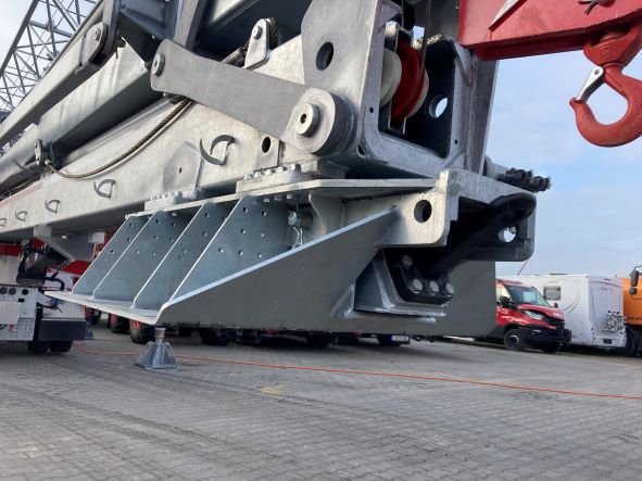 • Turm, Ausleger und Hauptteile des Fahrwerks verzinkt, Streben und Unterwagen des Kranes in rot